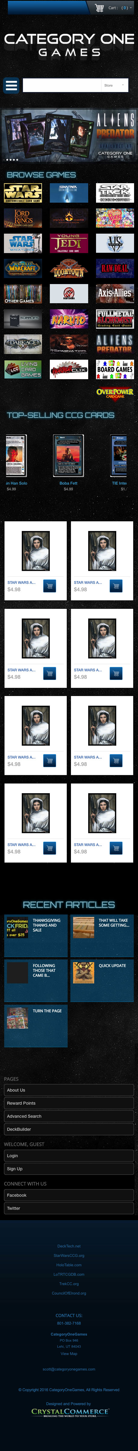 CategoryOneGames is a niche hobby company specializing in CCG, Comic Books, Classic Video Games and collectible Toys. C1G is the largest supplier of Star Wars, Star Trek and Lord of the Rings gaming cards in the world.
